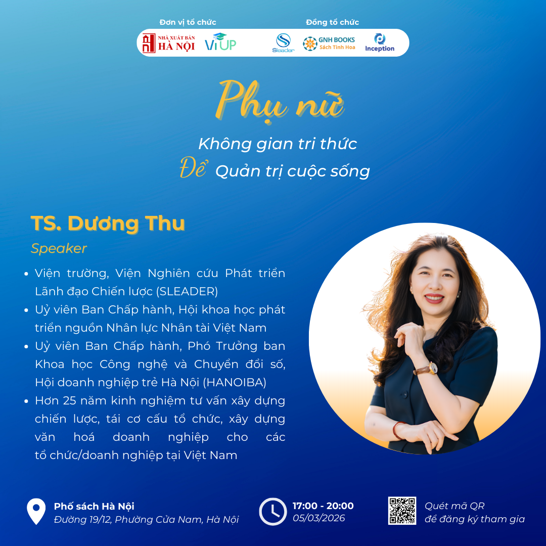 Trong khuôn khổ Chương trình “Phụ nữ – Không gian tri thức để quản trị cuộc sống” tổ chức tại Phố Sách Hà Nội ngày 05/03/2026, BTC trân trọng giới thiệu sự có mặt của 4 diễn giả sẽ cùng nhau kiến tạo một buổi đối thoại sâu sắc thực tế & truyền cảm hứng.
